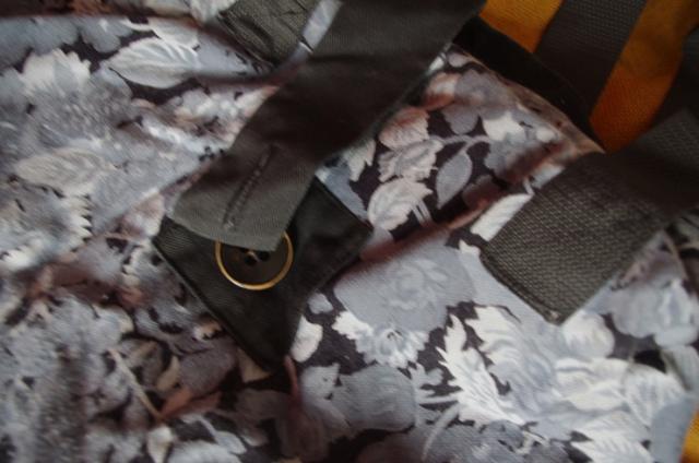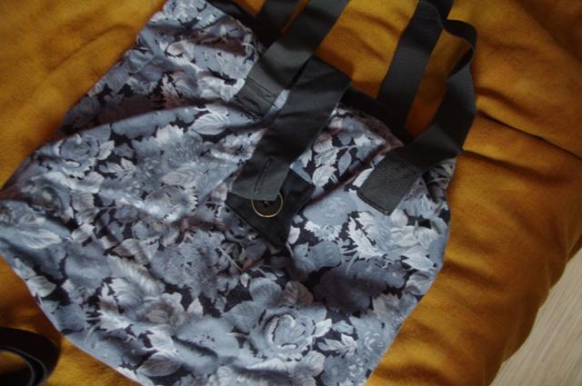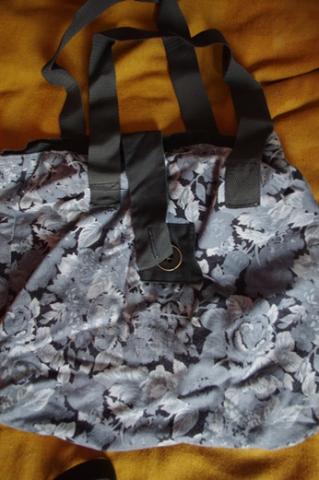 Gėlėta, pilka, maišo formos rankinė. Talpi. Rankų darbo.