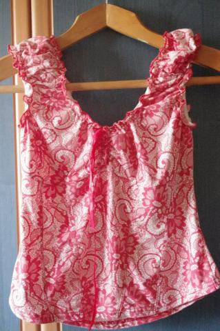Gelėta raudona palaidinė, trumpa, tamposi, tinka S ir M dydžiui.