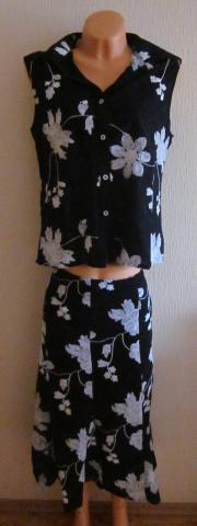 Juodas kostiumėlis, siuvinėtas baltomis gėlėmis. Dydis 44, palaidinė 85E/F krūtinei tinkama. Defektų nėra. Išmatavimai (ramybės būsenoje): Palaidinės ilgis 59 cm, krūtinės apimtis 54x2 cm, sijono ilgis 74 cm, juosmens apimtis 46x2 cm, klubų apimtis 54x2 cm.