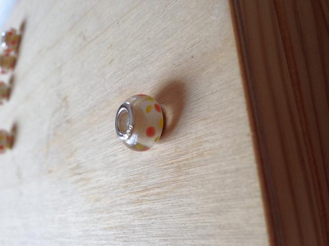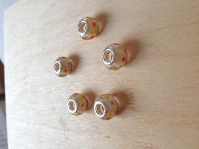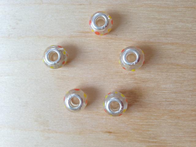 *oranžiniai geltonai taškuoti skaidrūs karoliukai; *atrodo labai gaiviai ir pavasariškai; *diametras: 13mm; *storis: 7mm; *viduriuko vidinis diametras: 5mm; Sudėtis: Murano stiklas; 925 sidabras;