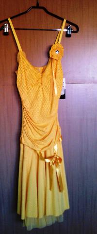 Ryški geltona suknelė. Nė karto taip ir neužsidėta, pirkta vestuvėms eiti į pamerges :) Su elastanu, pamušalas su tiulio audiniu. Tas kaspinėlis priekyje nusiima. Tinka bet kokiai progai :)