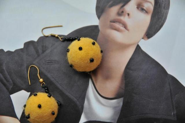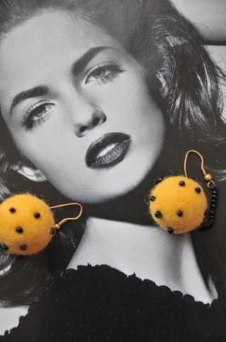 Geltoni vilnoniai auskarai. Juos vadina "Cheese Balls"