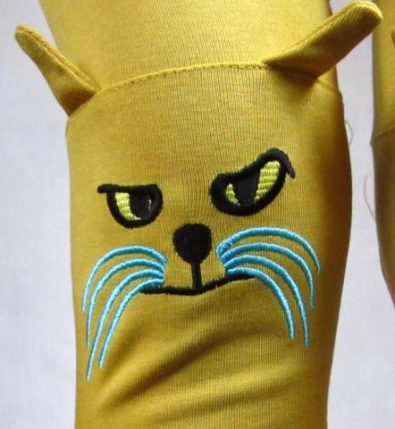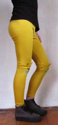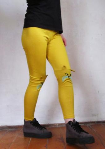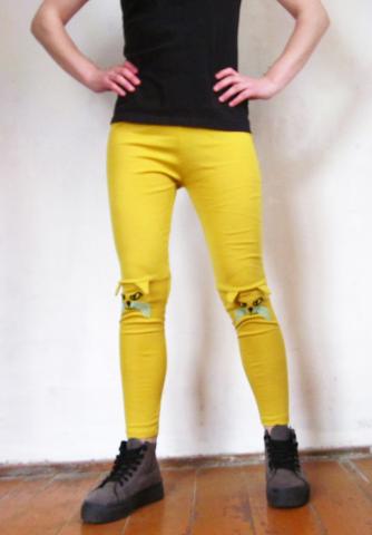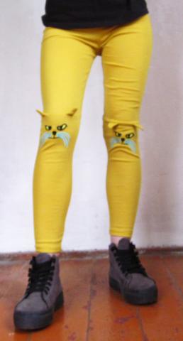 Geltoni leginsai, ant kelių išsiuvinėti katinai su styrančiom ausim.
