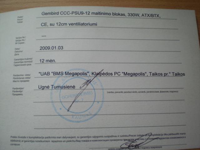 Nenaudotas maitinimo blokas. Pirktas 2009-01-03, bet nenaudotas, nes kompiuteris neveikė net po maitinimo bloko pakeitimo. Yra 12 mėn. garantija