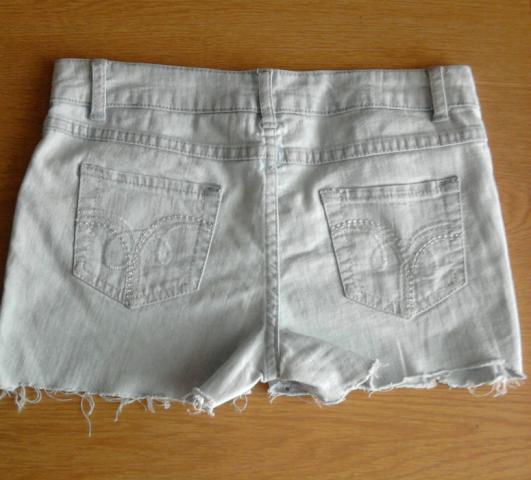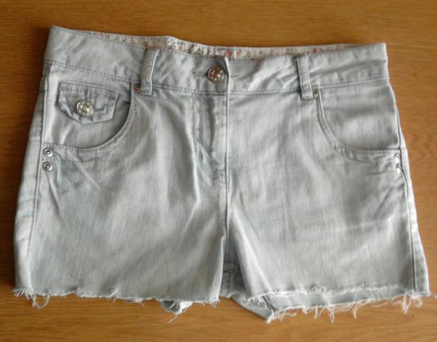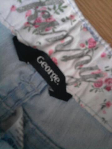 Trumpučiai labai gražūs, šviesios spalvos George šortukai. Tik yra mažytis defektas kurį matote nuotraukoje, vos įžiūrimas mėlynas taškelis ant šortų, bet manau gerai išskalbus išsiplautų.:) Jei reikia išmatavimų drąsiai klauskit. :)