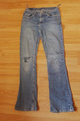 Tikri džinsai turintys savo ilgą gyvenimą (atkeliavę iš US prieš beveik 11metų), bet puikiai atrodantys. Turi ant kiekvienos klešnės po rankomis siuvinėtą širdutę. Dešinė klešnė ties keliu gerokai prairusi ir turi didelę skylę. Nugaroje diržo kilpelės nutrūkusios (matosi nuotraukoje), norint galima prisiūti. Kelnių apačia taip pat prairusi. Galima pasidaryti puikius šortus! Tinka smulkesnei merginai (ūgis 170)