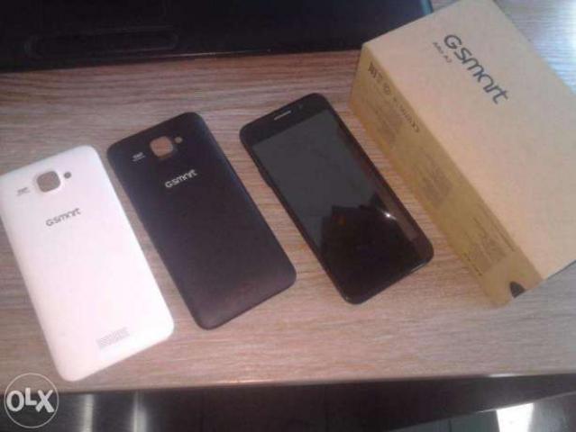 Gigabyte Gsmart Alto A2 , su dviem dangteliais, juodu ir baltu, dėžute ir pakrovėju.