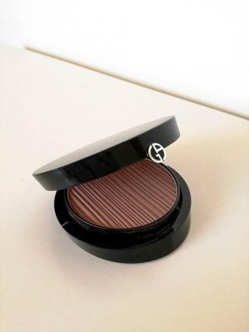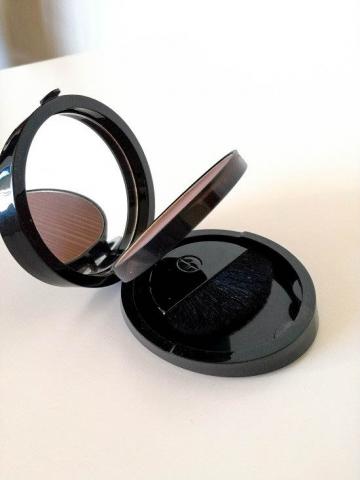 Kelis kart naudotas, puikios būklės originalus Giorgio Armani Sun Fabric bronzeris (Sheer Bronzer). Po apačia yra antras skyrius šepetėliui (nenaudotas).