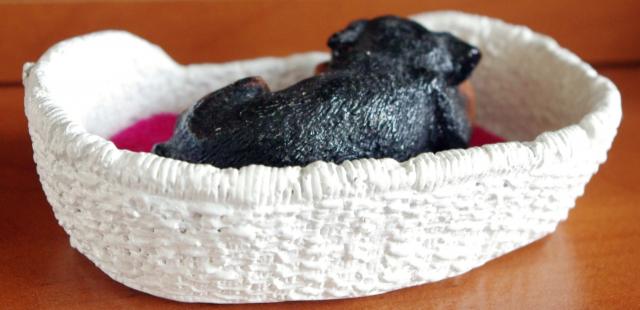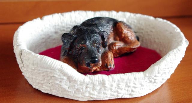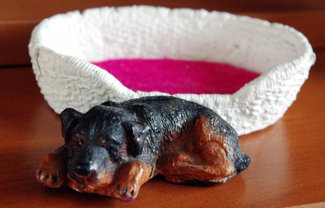 2cm aukščio, 5cm pločio. Gipsinis dobermanas su lovytė, kurios dugnas - raudona materija. Šuniukas yra išimamas. Puikiai tiks kolekcijoms. Yra kitų šunų statuečių.
