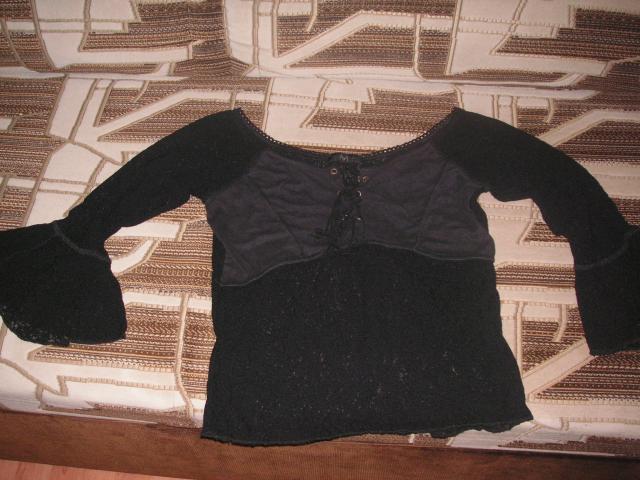 Juodas, su nerinukais, toks pusiau permatomos ties nertinukais. Rankoves 3/4 :) Am kas dar... Priekyje raistukai. Defektu lyg ir nera. O dydis tai s/m nera parasytas :) Jei domintu galeciau ismatuoti apimtis :)
