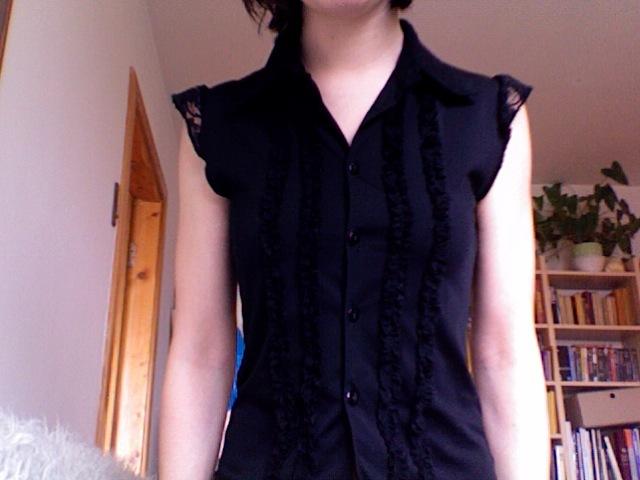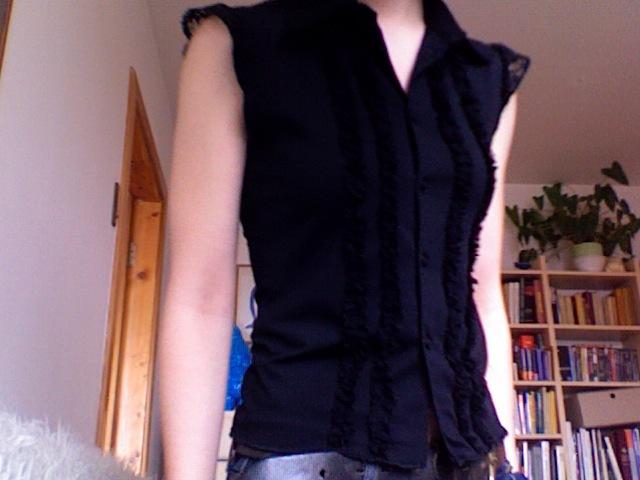 Juoda. Su raukiniais. Ant rankovių ir apykaklės - tokie kaip nėriniai. Sintetinė. S arba XS.