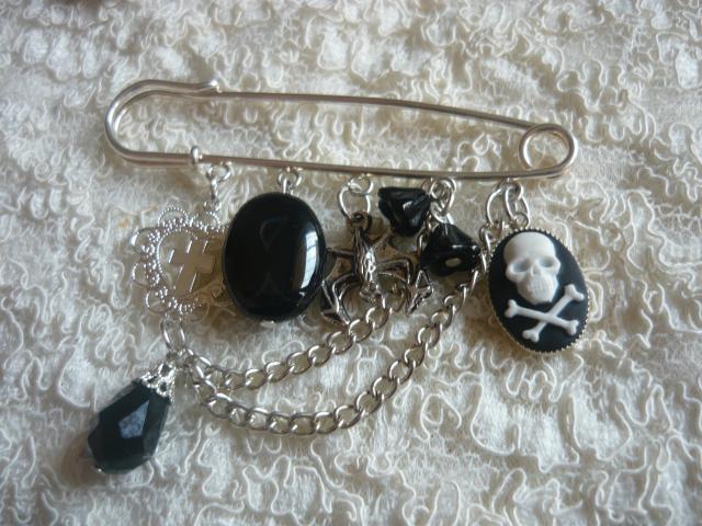 gotiško stiliaus sagė su kaukoliuko kamėja, agatu ir šikšnosparniuku :) mylinčioms juodą gotikinį stilių. mielas aksesuaras tinkantintis ir dienai ir vakarui. Vertinu 25lt