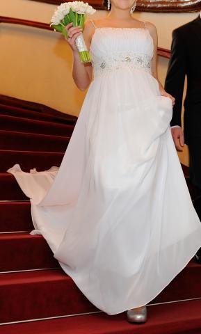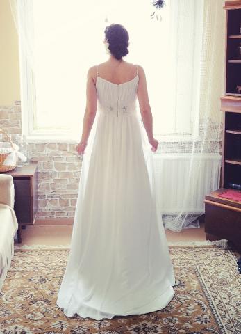 Labai gaži paprasta, bet neprasta graikiško stiliaus vestuvinė suknelė. Dėvėta tik kartą. Dydis 14, lengvai taisoma, su šleifu. Siuvinėta. Kartu parduodu ir batukus prie šios suknelės. Sidabrinės spalvos, ant platformos. Labai patogūs. Batukų kaina 150Lt