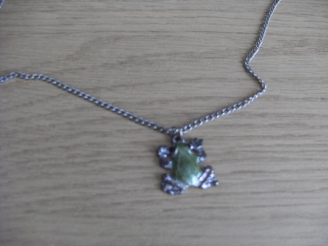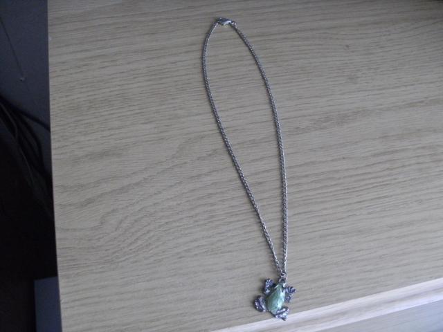 grandinėlė su varlytės formos pakabuku. Per puse sulenktos grandinėlės ilgis: 21cm. Pakabuko dydis 2x2cm.