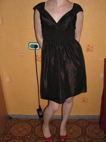 Suknelė dėvėta tik kartą vestuvėse :) Iš zaros. xs dydis. Jos spalva tai ruda, tai violetinė, tai mėlyna, tokia įdomi spalva :) Labai graži man ji, bet kažkaip nelimpa ji man. Sudėtis: 28 proc. polisterolis, 72 proc. acetatas.
