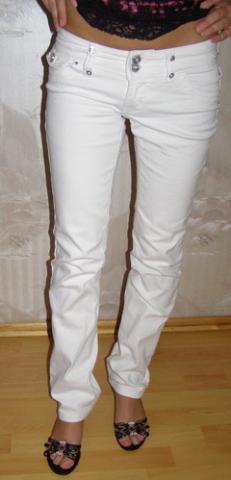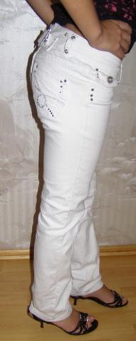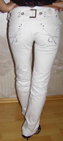 Gražios baltos kelnės, su akutėmis. Medžiaga panaši į džinsų. Labiausiai tiktu žemom panelėm, bet yra palikti ir atsilenkti medžiagos jeigu butu per trumpos. Dydis XS.