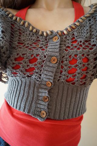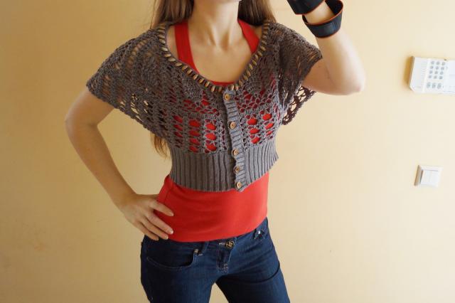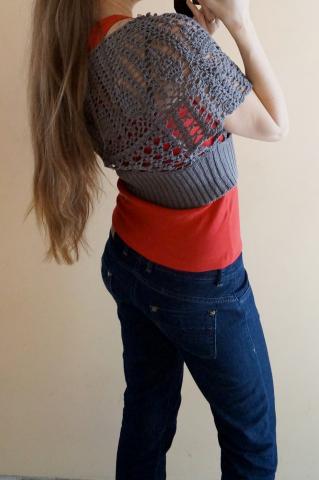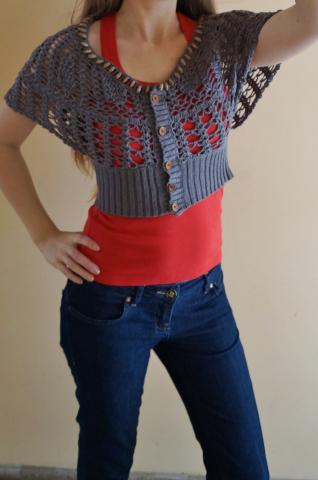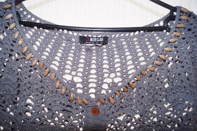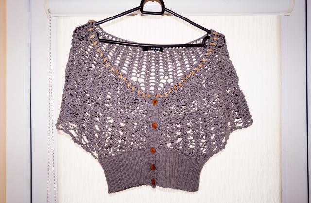 Nuostabus Morgan bolero, nertas, pilkas, puoštas sendintomis medžio detalėmis, medinėmis sagutėmis, kurios nėra tik imitacija - galima atsisegti. Užsidėjusi buvau tik porą kartų - kaip naujas. Dydis labai universalus. Tiks XS, S. S/M, M, gal net L. Išmatavimai: Siaurosios dalies, kuri eina per liemenį ilgis patempus proto ribose 42 cm, ramybėje 30 cm. Ilgis 37 cm