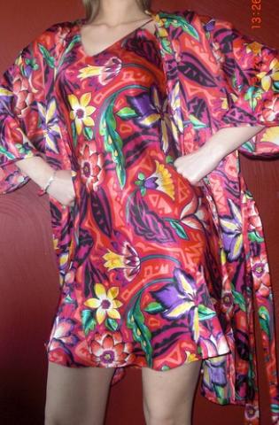 kaiP naujas miegojimo komplektukas : chalatas ir naktinukai :) Labai garzuios spalvos ryskios, spalvongos ;) naktinukai labai grazus jaunatviski, dydis S/m :] medziagyte slidi :]