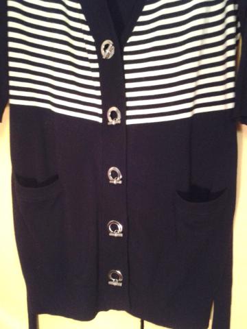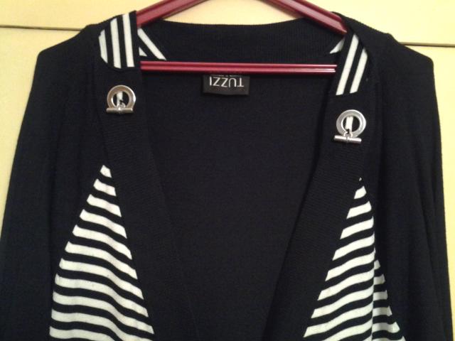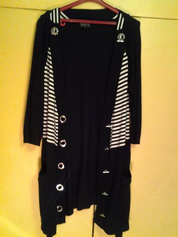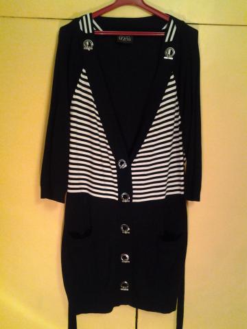 Vokiečių kompanijos TUZZI ilgas megztinis,su metalinėmis,sunkiomis sagomis,kišenėlėmis ir dirželiu.Priekis padryžuotas.Labai švelnus ir jaukus.Sudėtis 80 % viskozė ir 20 % poliamidas.Dydis L.Labai tamprus.Tiesus modelis.Ilgis 88 cm,krūtinės apimtis 104 cm.Rankovės trijų ketvirčių, jų ilgis nuo peties 51 cm.