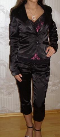 Gražus juodas atlasinis kostiumėlis. Užsidėtas vos kelis kartus. Švarkėlis 36 dydis(s) , bridžai 34(xs).