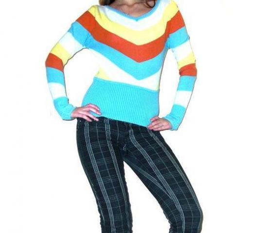 labai fainas grazus ir spalvingas ;) yra devejimo zymiu,rankovyciu galuose melyna spalvyti truputely pablukusi, bet visdar galimas nesioti ir atrodo tikrai super ;) galima ir viena pety apnuoginti ;)