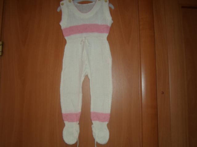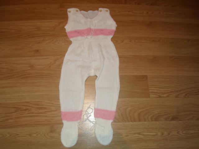 Balti su ružavomis juostelėmis be rankovių šliaužtinukai, megzti. Nauji ne karto nedėvėti. Dydis galėtų būti 68/74 cm. Išmatavimai: ilgis (nuo viršaus iki apačios kulniuko) - 58 cm, krūtinė - 50 cm, klubai - 52 cm.