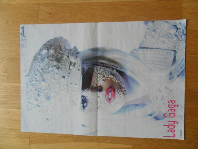 Abipusis plakatas. Is vienos puses Green Day grupe, o is kitos puses Lady Gaga.