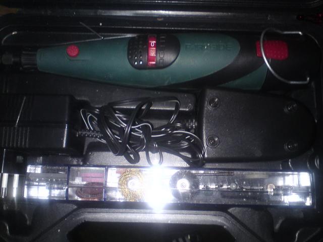 Puiki nesudeveta rankdarbiu masina. Pirkta Vokietijoje. Gamintojas Parkside. Turi akumuliatoriu, pakroveja, lagamina, dokumentus ir daug visokiausiu slifavimo, grezimo bei kitokiu antgaliu. Gali suktis iki 20.000rpm, puikiai tinka visokiems rankdarbiams bei maziems darbeliams namuose.