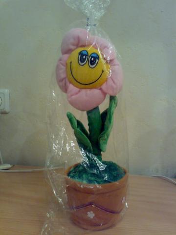 Apie 35cm. Dedasi trys AA tipo elementai. Pvz suplojus pradeda sukinėtis i šonus gėlytės stiebas ir groti muzikėlė...