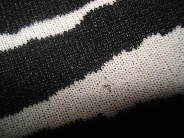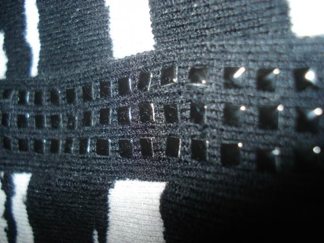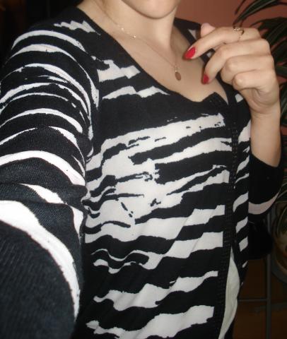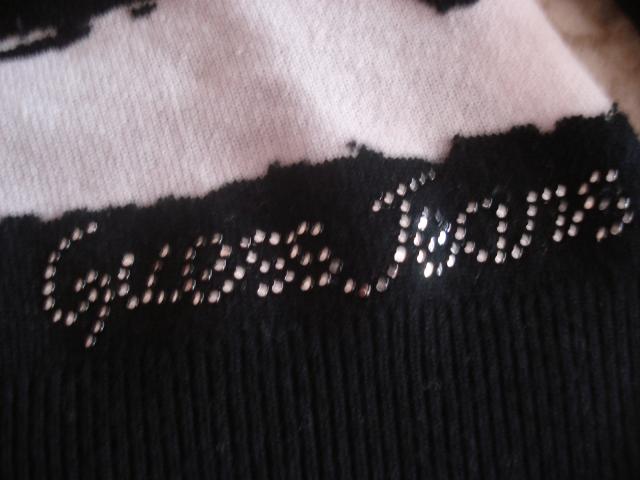 Zebriukas Guess laukia naujos šeimininkės! Megztukas baltai juodais dryžiais, iš nugaros juodas. Uzsisega su kniedėmis, tad sagučių nė nesimato. Sagų vietoje yra visa linija mažų kniedžių, kurios itin madingos. Fotografuota ant S, bet labiau tinka ant M. Turi vieną defektą- viršuje yra iširimas, kuris nesimato ir yra labai mažas. Megztuko apačioje su blizgučiais užrašytas inicialas (visos akutės vietoje).