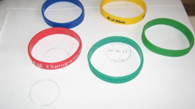 Įvairios guminės apyrankės: Geltona: Aš už Vilnių Raudona: ES programa "Veiklus jaunimas" 2007-2013 Mėlyna: "Vaikams" Žalia: Live with no regrets dar viena žalia: saving lives one test at atime