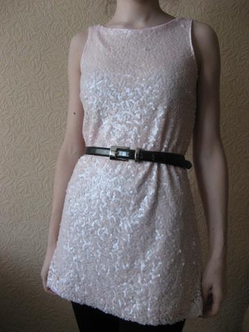 Nuostabi žėrinti klubinė ir vakarinė suknelė - tunika su rausvais žvyneliais, tik kartą užsidėta, beveik kaip nauja, be defektų. Dydis XS, tiks ir S. Neseniai atsivežta iš UK. Žvyneliai prisiūti ant gipiūro, po apačia minkštas pamušaliukas. Tikrosios spalvos su fotiku neisgavau, panaši į padidintą nuotrauka, bet kiek šviesesnė, šviesi rožinė. Parduodama be dirželio.
