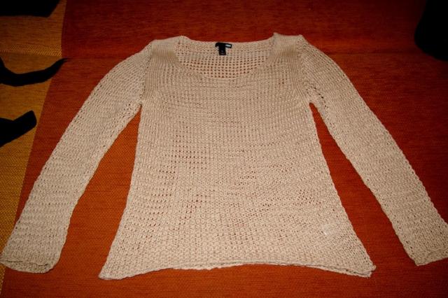 Gražius megztinukas, smėlio spalvos, įdomiai ir lengvai krentantis. Rašo L, bet tinka labiausiai M dydžiui. Man netinka spalva.H&M firmos.