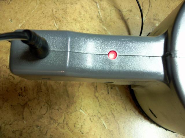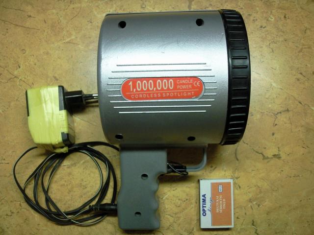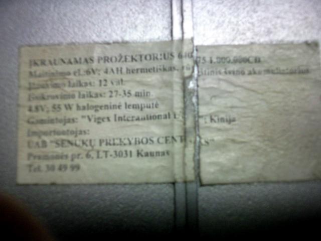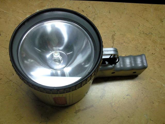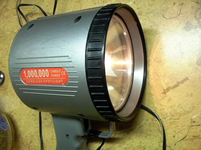 Ikraunamas is elektros tinklo halogeninis prozektorius su rankena ir pakroveju. Prozektorius turi 55 W. halogenine lempa, kuri gerai sviecia, sviesos spinduli fokusuoja i viena taska todel labai toli sviecia. Nedidelis trukumas toks, kad reikia ideti nauja jungikli, buves sugedo. Dabar yra isvesti du laidukai kuriuos sujungus prozektorius isijungia. Taip viskas veikia gerai. Pakrovejas krito ant grindu , iskilo todel teko su lipnia juostele sutvirtinti.