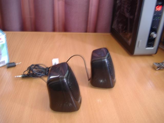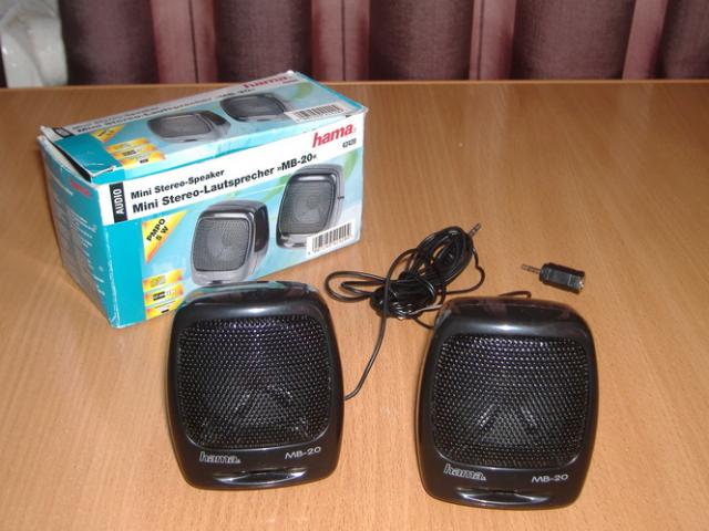 Kolonėlės jungiasi prie bet kokio mp3 grotuvo. Pliusas - nereikia pirkti baterijų, maitinimą gauna iš playerio. Groja neįspūdingai. Bendras galingumas 5 W.