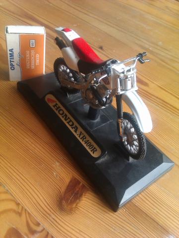 Honda XR400R motociklo modelis. Sukiojasi vairas, yra galinis amortizatorius, kojelė, guminės padangos. Prie stovelio prisuktas varžtu, galima nusiimti.