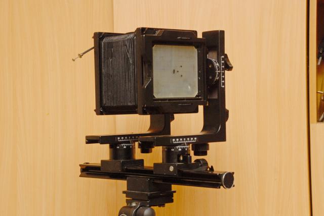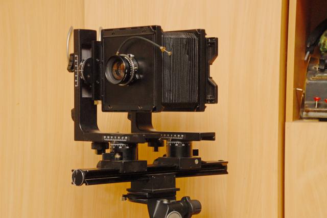Kokybiska, profesionali didelio formato kamera su daug komponavimo, ryskumo zonu monipuliavimo funkciju. Kartu Fujinon f/5,6 150mm lesis, kietas dėklas ir 10 kaseciu 4x5 plokstelems.