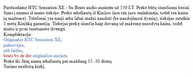 Prekė būtų siunčiama tiesiai Jums į namus iš mano tiekėjo. Prekė atkeliautų iš Kinijos (nes ten juos surinkinėja, todėl ten kaina jų mažesnė). Telefonai yra nauji arba labai mažai naudoti (be naudojimosi žymių), tiekėjas suteikia 1 metų Kinišką garantiją. Tiekėjas prekę siunčia kaip dovaną už mažesnę nurodyta kaina, todėl muito ir pvm turėtumėte išvengti. Komplektacija: HTC Sensation XE, pakrovėjas, beats originalios ausinės (jų vertė 340 LT).