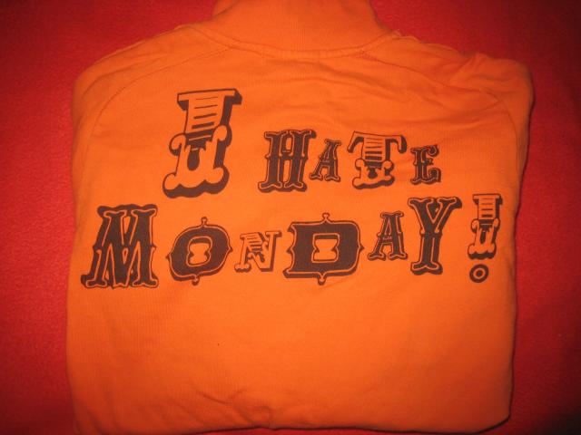 Išsaugotas ir labai mažai nešiotas, pirktas gan senokai :) ant nugaros užrašas "I Hate Mondays", priekyje su kišenėlėmis.