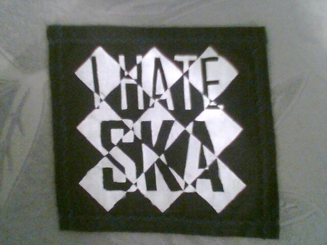 Rankų darbo tepliojimo (naudojant trafaretą) antsiuvas su užrašu "I HATE SKA". Medžiagos matmenys - 13x12cm. Naudoti tekstiliniai dažai, medžiaga ne itin kieta (suprask, ne džinsinė). Kreivokai persiūtas.