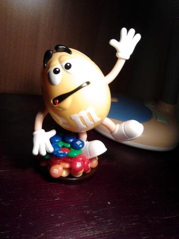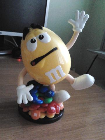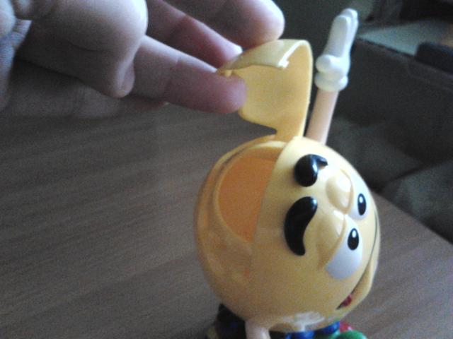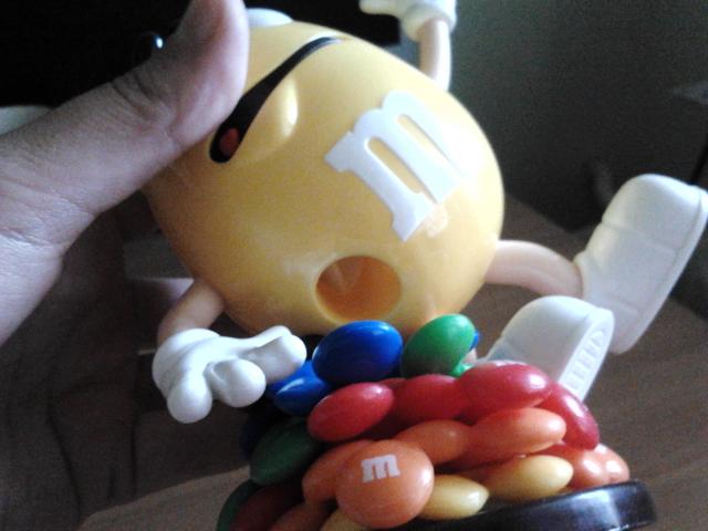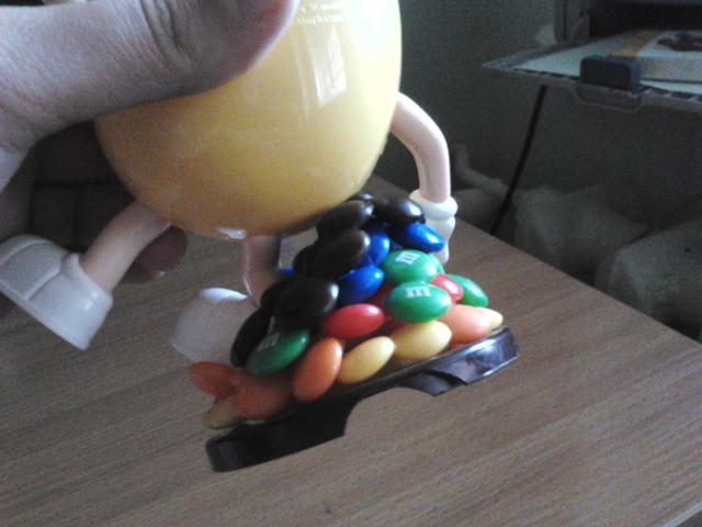 zaisliukas i kuri galima imesti m&m saldainius ir paspaudus ranka jie iskris. Defektas matosi paskutineje foto.