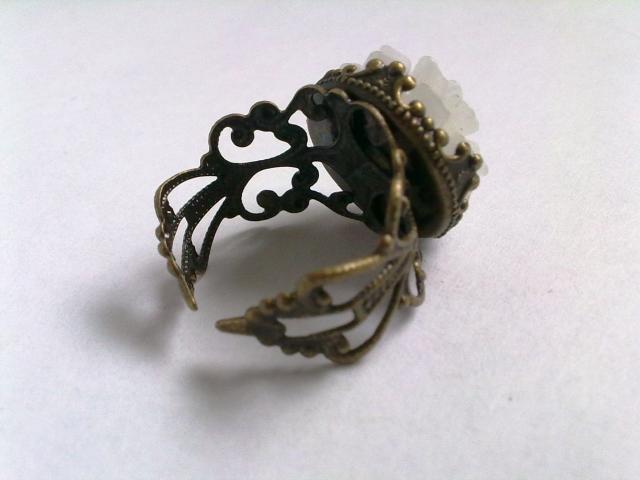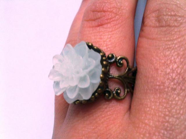 Sendinto žalvario žiedas su matine balta-skaidria akriline chrizantema. Žiedo dydis reguliuojasi