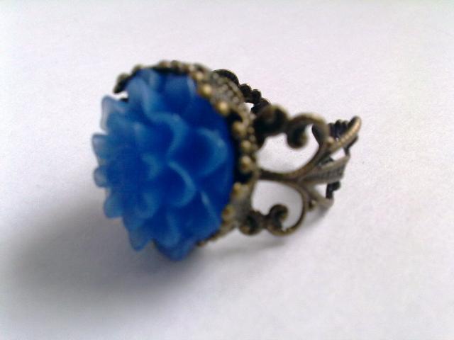 Sendinto žalvario žiedas su matine mėlyna akriline chrizantema. Žiedo dydis reguliuojasi
