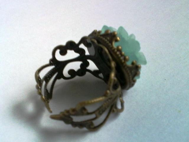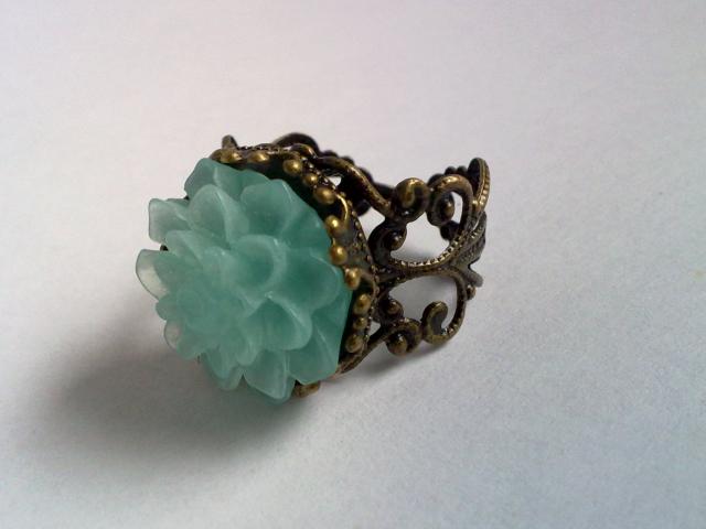 Sendinto žalvario žiedas su matine akvamarino akriline chrizantema. Žiedo dydis reguliuojasi