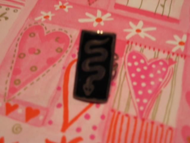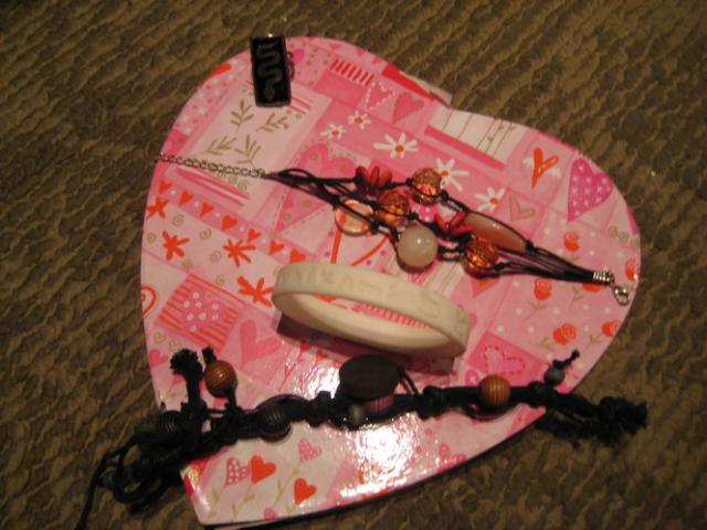 Žiedas su gyvate, reguliuojasi dydis. Apyrankė oranžinė iš ibero, kita su užrašu "vaikams". Juoda su mediniais karoliukais.