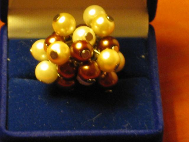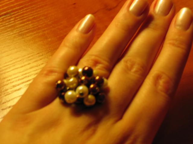 Žiedas su rusvais perliukais, bižuterija, dydis reguliuojamas. Elegantiškas žiedukas, tinkantis prie papuošaliukų su perliukais.