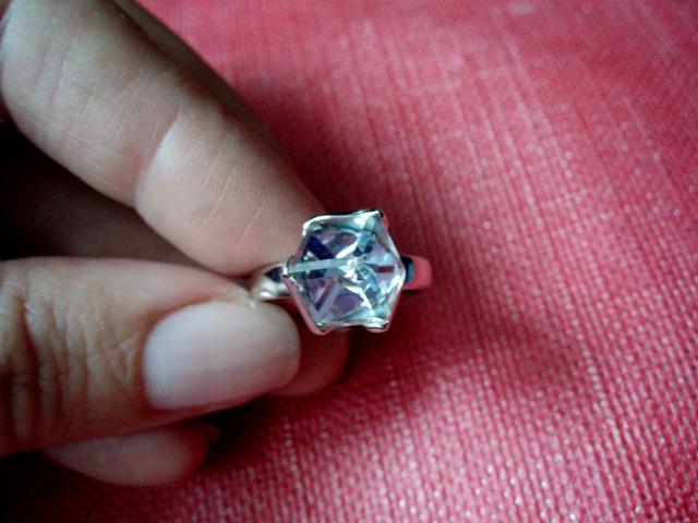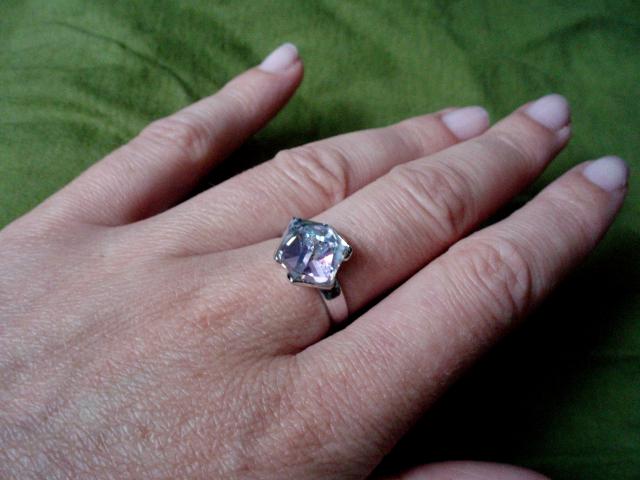 Du bižuteriniai žiedai su Swarovski kristalais ( vienas gal 18 dydžio, kitas 17 dydžio). Kristalas turi švelniai rausvą atspalvį žiūrint iš priekio, o žiūrint iš šono - atrodo skaidrus. Abu žiedai turi tą patį defektą - truputi nuskilęs kampelis (matosi antroje nuotraukoje).