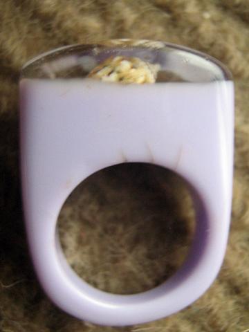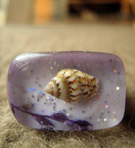 Violetinis. Plastmasinis. Su kriauklyte ir blizgučiais viduje. Šiek tiek suskilęs. Matosi foto.