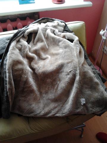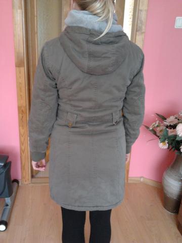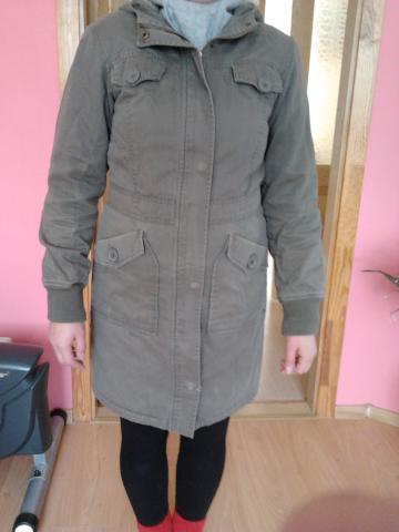 Rudai žalia (chaki) žieminė striukė su kailiuku. Dydis S. Su kapišonu.
