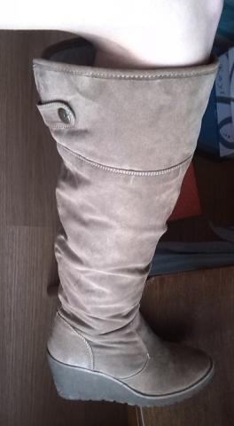 Labai patogūs, žieminiai moteriški batai su kailiuku viduje. Labai šilti, spalva- auksinė/šviesiai ruda. Versta medžiagytė, todėl perbraukus su ranka šukuojasi ir atrodo nuotraukose margi.